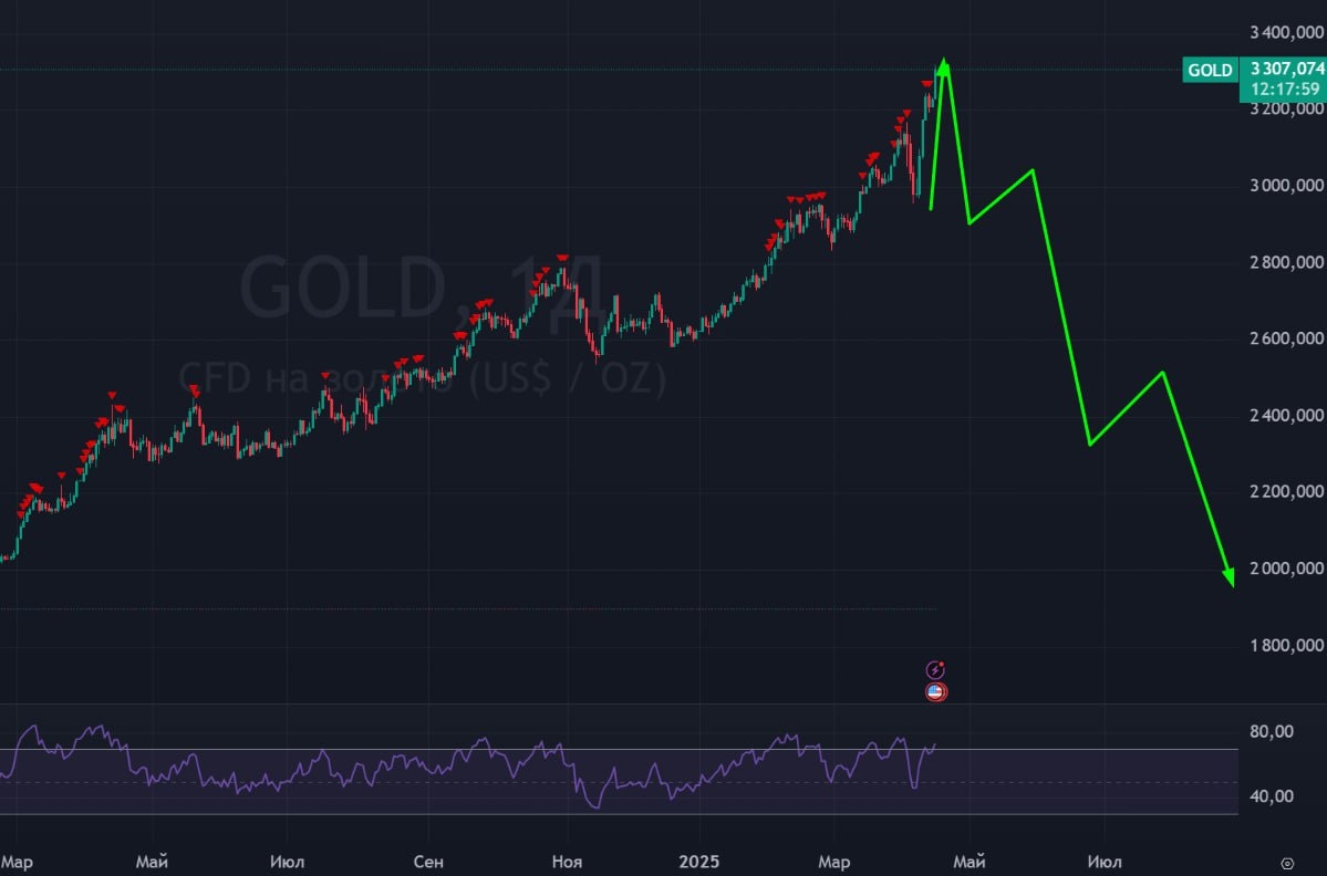 🥇 #Золото #GOLD #bogdanoffinvest 🟢 Пришли на 3300! Тут проходит пересечение трех прямоугольников, которые я показываю на видео, поэтому начинаю искать шортовые сетапы. Последние дни в золоте идет практически вертикальный рост, что говорит мне о том, что разворот произойдет очень скоро. Золото должно коррелировать с DXY и US10Y, а они как раз сегодня идут наверх. Так что все условия для коррекции имеются. 🟢 А так же обратите внимание, что как только МИД Китая заявили, что готовы к переговорам по пошлинам, то индексы стрельнули вверх. а золото вниз. Из этого можно сделать вывод. что текущий рост в золоте создан перетоком инвесторов из неопределенности в золото, как только ситуация налаживается, то идет отток из золота в акции. Так же напомню. что в случае черного лебедя, когда страхи будут большими, золото не будет являться убежищем. оно попадет под распродажу так же, как и другие активы, а с учетом того, что этот актив не знал коррекций, падение тут может быть значительным.