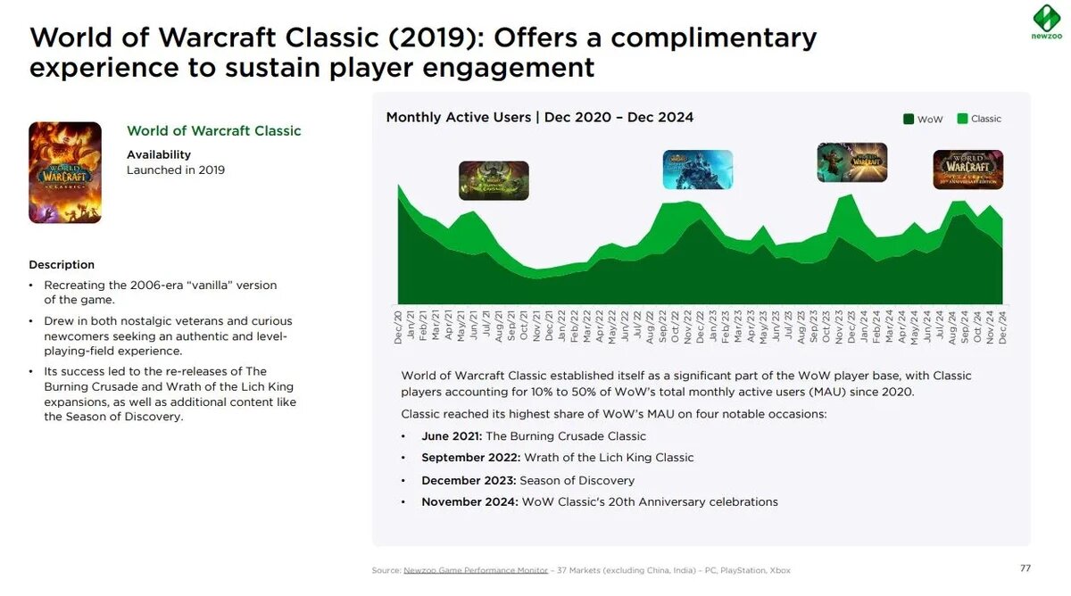 Аналитическое агентство Newzoo в своем масштабном годовом отчете уделила отдельное внимание продуктам студии Blizzard (и не только ей, но речь сейчас не об этом). Вот ключевые тезисы. Blizzard мастерски использует ностальгию как мощный инструмент для привлечения игроков. Хотя студия не всегда сразу улавливала желания сообщества, запуск WoW Classic стал переломным моментом — рискованный шаг полностью окупился, дав значительную прибыль. По данным Newzoo, с 2020 года от 10 до 50% ежемесячной аудитории WoW приходится на версию Classic. Точные цифры назвать сложно из-за пересечения аудиторий современной и классической версий. Пики активности закономерно совпадают с релизами: Успех WoW Classic вдохновил индустрию на "рекурсивную ностальгию" — перезапуск культового контента с минимальными затратами и максимальной отдачей. Переход на F2P-модель в 2022 году дал 10-кратный рост аудитории. Однако после релиза в 2023 году игра постепенно вернулась к показателям OW1, а с выходом Marvel Rivals и вов