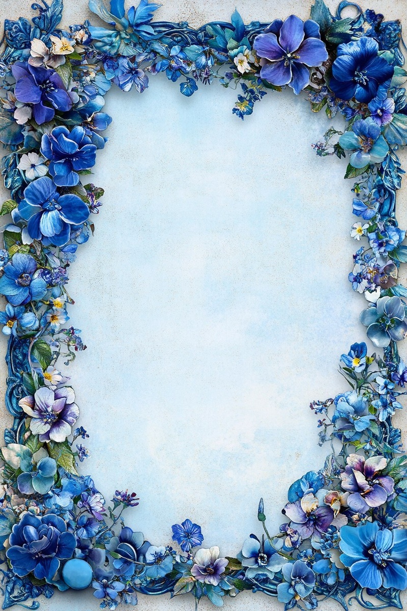 Создано на основе запроса: hyperrealistic azulejos style baroque page frame decorated with lots of blue and purple flowers, mostly blue