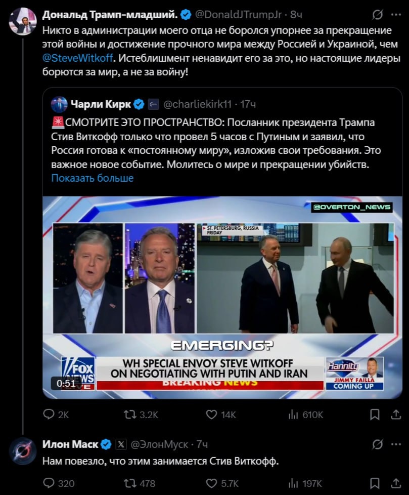 В ответ на пост Вчера писал о фактическом расколе в "команде Трампа" по отношению к России. Близкое окружение Дональда Трампа поддерживает усилия спецпредставителя Уиткоффа по налаживанию диалога с Россией, но часть американского истеблишмента - неоконы по прежнему заражены русофобией и требует введения санкций. Публичная поддержка Уиткоффа - это попытка повлиять на неопределившуюся часть истеблишмента.