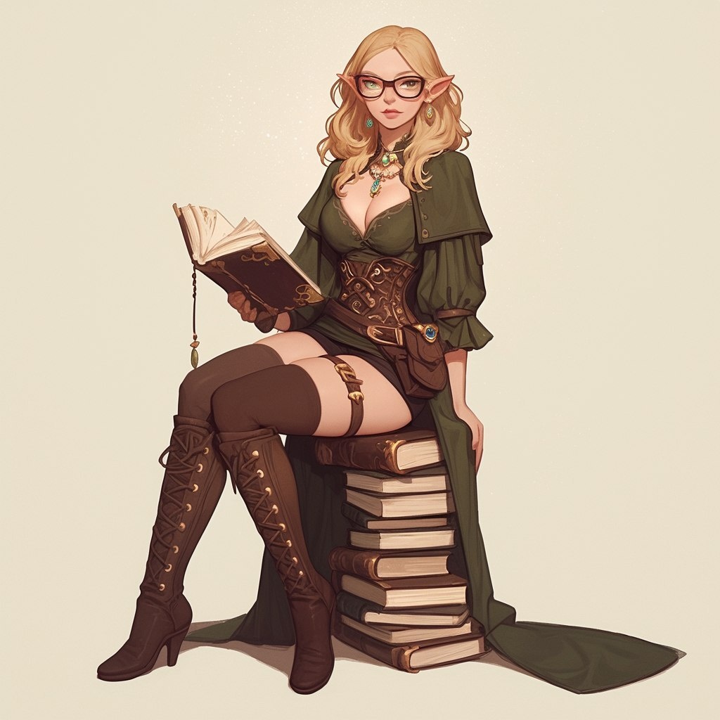 Создано на основе запроса: pretty evil elven librarian woman wearing tall leather boots