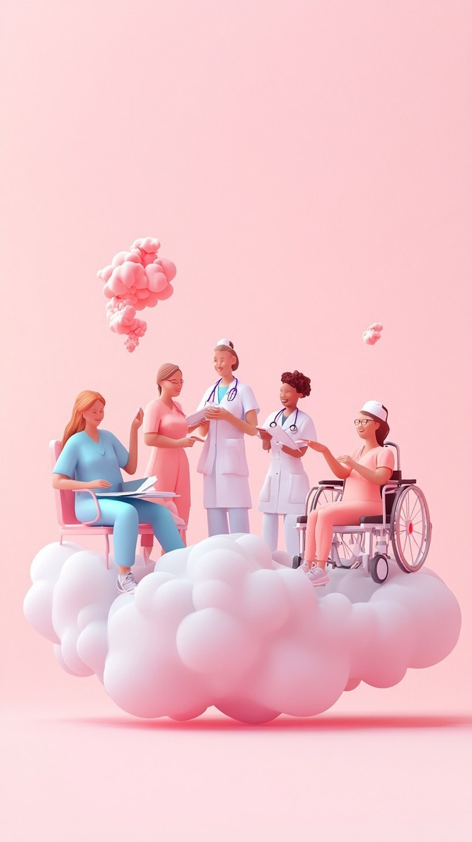 Создано на основе запроса: Create a poster where the nurses are presented as 3D cartoon characters, working on top of a cloud