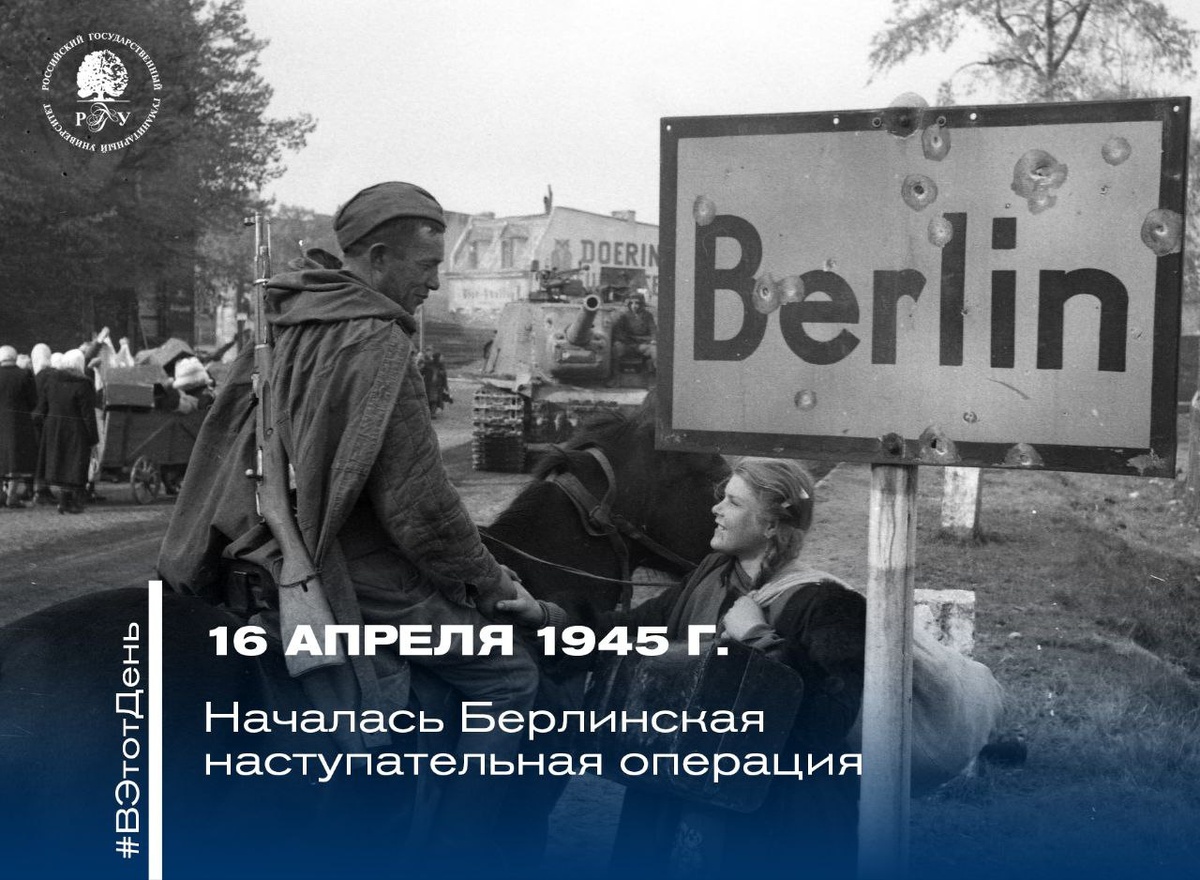 ▎ Дорога на Берлин #ВЭтотДень 16 апреля 1945 года началась Берлинская наступательнвя операция, одна из последних стратегических операций советских войск, в ходе которой Красная Армия заняла Берлин. ➡️ Основной целью Берлинской операции было не только окружить Берлин, но и добиться полной капитуляции боеспособных частей Третьего рейха. ⚪ 16 апреля в 5 часов утра началась артиллерийская подготовка. Через час части Красной Армии пошли в атаку. Противник оказывал ожесточённое сопротивление; ⚪ 23 апреля Красная армия вышла к окраинам Берлина, где начались уличные бои; ⚪ вечером 28 апреля советские войска вышли к Рейхстагу; ⚪ лишь 2 мая начальник обороны Берлина генерал Г. Вейдлинг сдался в плен и отдал приказ войскам прекратить сопротивление. ⚡ Взятие немецкой столицы ознаменовало скорый крах нацистского режима. 9 мая 1945 года был подписан Акт о безоговорочной капитуляции Германии. 🔗 Хотите знать больше Великой Отечественной войне? Следите за разделом «80 лет Великой Победе» официаль