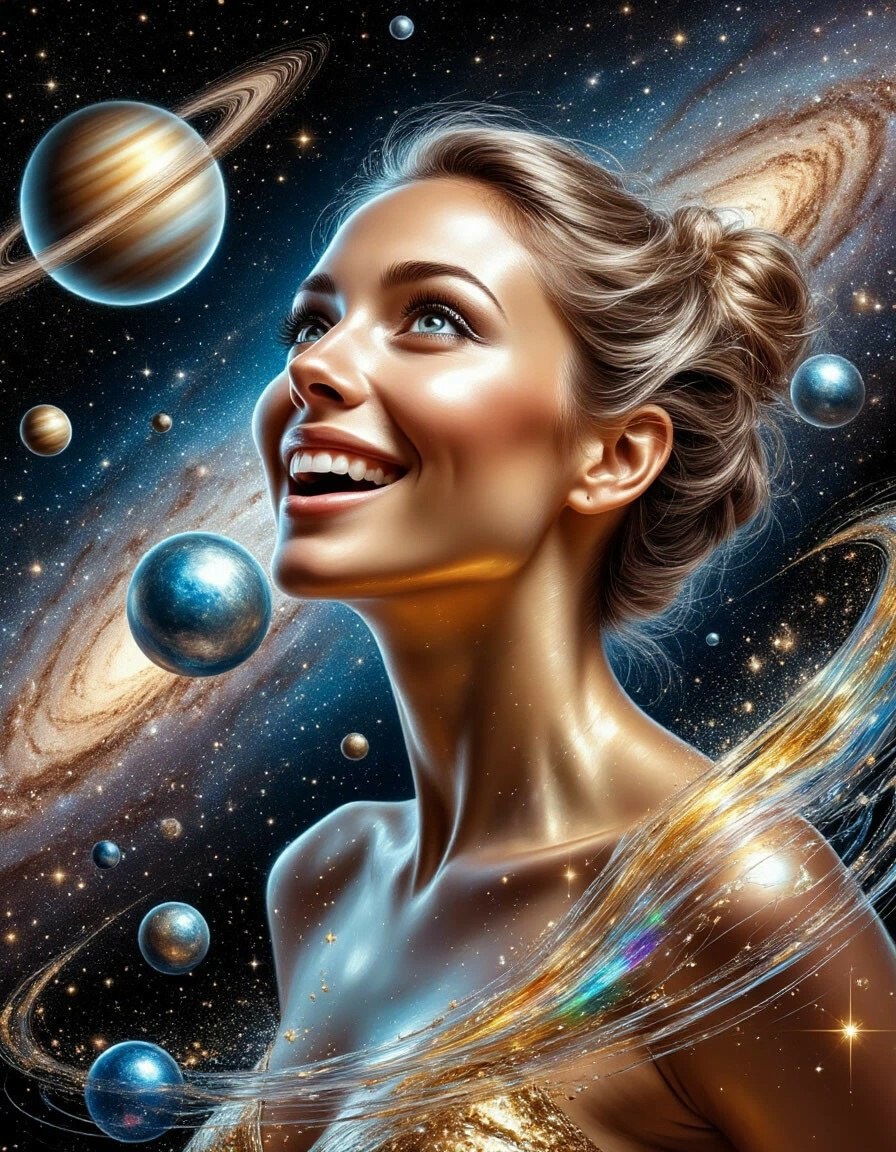 Доброе утро! Golden, platinum and blue transparent planets and spheres. Silvery-pearlescent galaxy, the abyss of space with a parade of planets, the Milky Way and stars. A woman in full growth, a dynamic pose, huge eyes, a sweet smile, surprise, joy. Rainbow luminescent fluorescent flowing gel, mother-of-pearl, liquid gold, mercury. surrealism fantasy. Streams of star dust rotate and swirl along a circular trajectory. close-up, neon airbrushing.