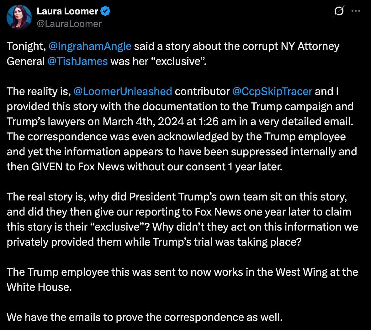 'Something is very wrong': Laura Loomer claims evidence against NY AG suppressed Loomer & her team allege they sent the Trump campaign evidence of misconduct by Letitia James last year but claim it was suppressed before being leaked to Fox, which aired it as an "exclusive." #LauraLoomer