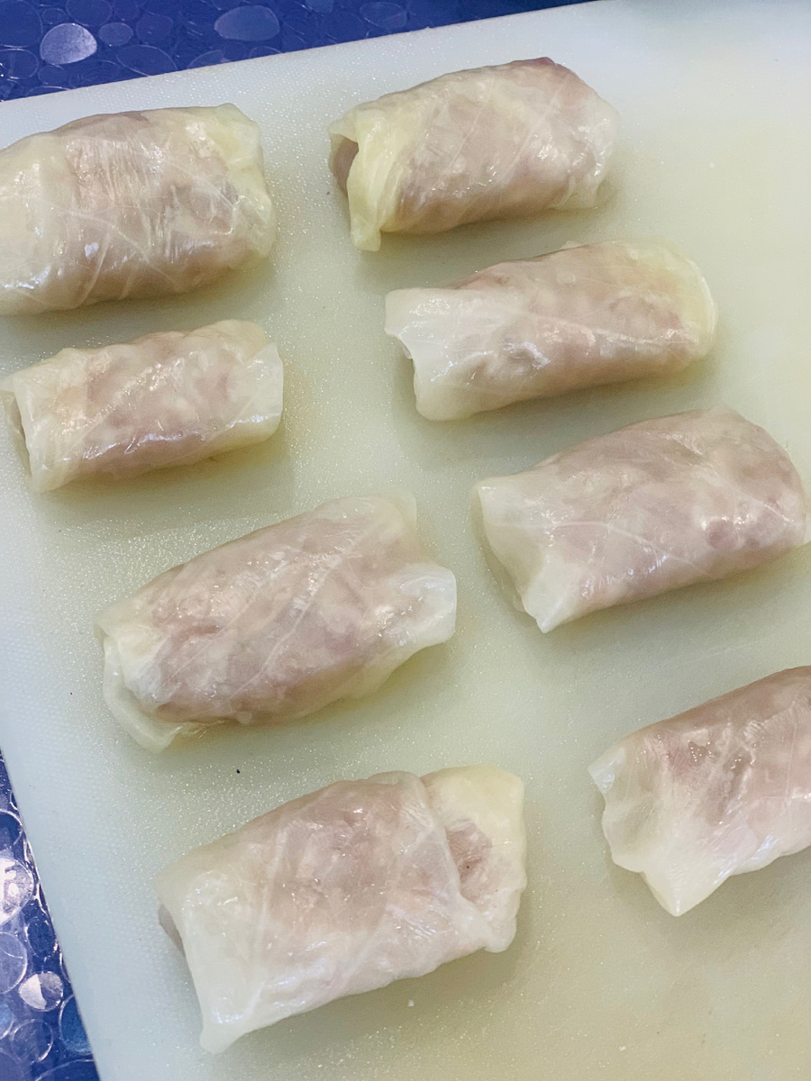 Прежде чем написать рецепт хочу сказать, что по трудоемкости этот вариант заготовки голубцов гораздо легче и проще именно из-за замораживания кочана, а не варки листьев капусты. Ингредиенты: мясо для приготовления фарша (у меня свинина) 2 кг; луковица 1 большая шт.; рис 200 гр.; соль, чёрный молотый перец; корочка хлеба и подготовить кипяток; замороженный целиком кочан капусты. Я замораживаю домашнюю капусту в пищевой пленке в морозилке специально, чтобы потом использовать для заготовок голубцов. Заранее достаем капусту, чтобы она успела разморозиться, сняв пленку. Затем по кругу вырезаем кочерыжку и отделяем друг от друга листы (они не рвутся и хорошо отделяются), разрезаем каждый лист пополам и удаляем толстую прожилу по-середине. Для фарша: отвариваем в подсоленной воде до состояния полуготовности рис и даем ему немного остыть, заливаем корочку хлеба в тарелке кипятком, перекручиваем мясо на мясорубке вместе с луковицей. Все это вместе соединяем, перемешиваем, солим и перчим, от