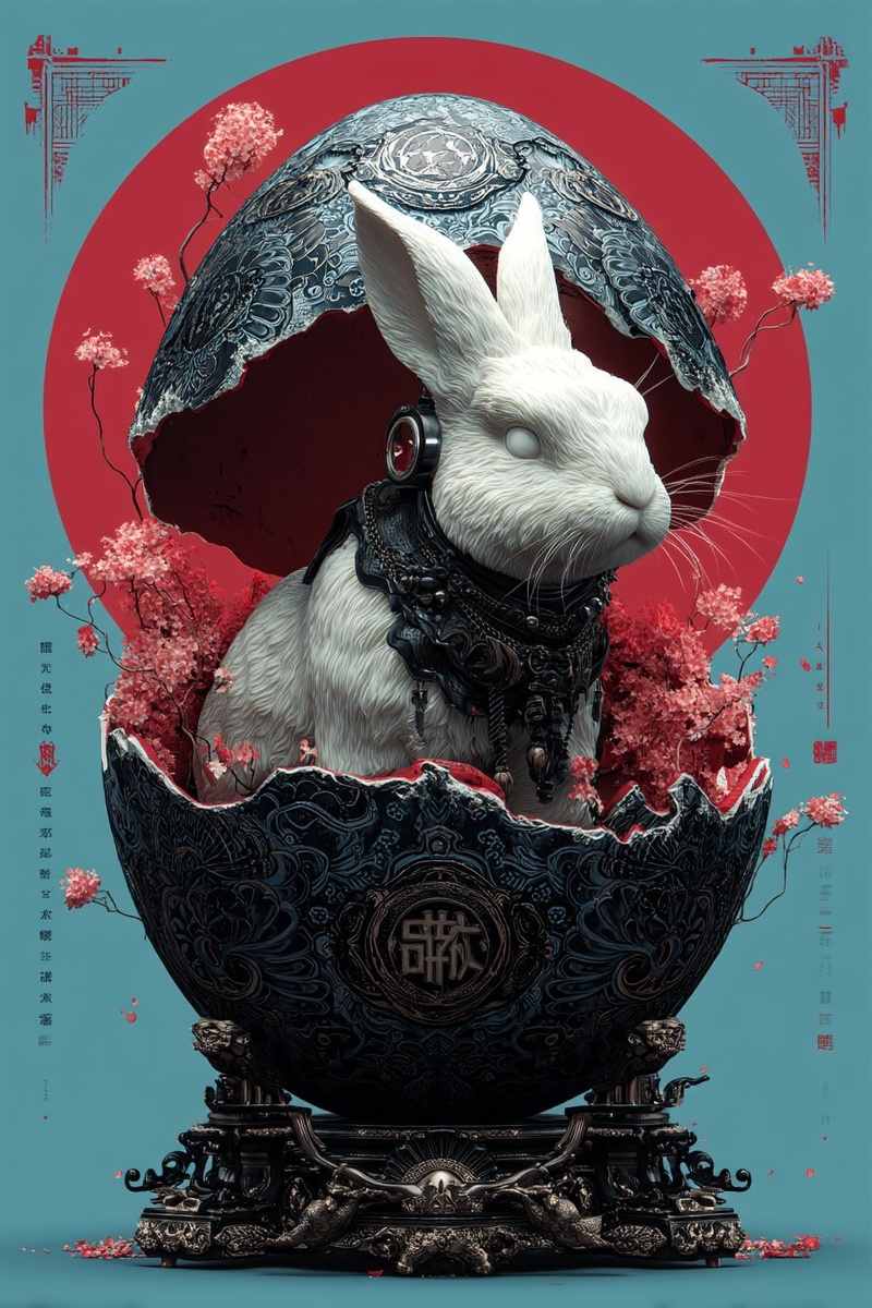 Создано на основе запроса: the easter bunny hatching from an ornate yokai easter egg