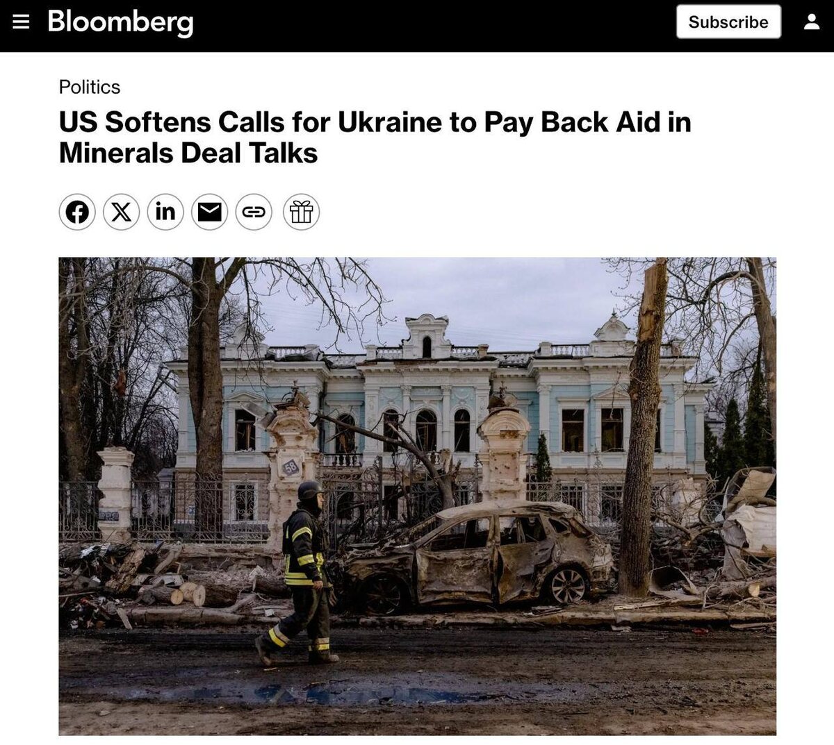 🇺🇸 США снизили требования к Украине по возврату оказанной помощи с $300 млрд до $100 млрд после переговоров в Вашингтоне на прошлой неделе, — Bloomberg.