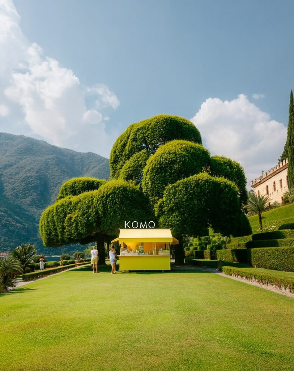 Создано на основе запроса: An outdoor gelato cart with bright neon-coloured yellow awnings nested between cypress trees on a lush lawn in Como. With a neon yellow coloured canopy with the word "KOMO" printed on top. Architecture photography, symmetrical. --- Автоперевод: На открытом воздушном мороженое с яркими неоновыми желтыми навесами, вложенными между кипарисовыми деревьями на пышной газоне в Комо. Интересно выглядит? 🤔 https://dzen.ru/id/65c0c65c86e4f837c27b24d7 #ИИ #AI #нейросеть #midjourney #art