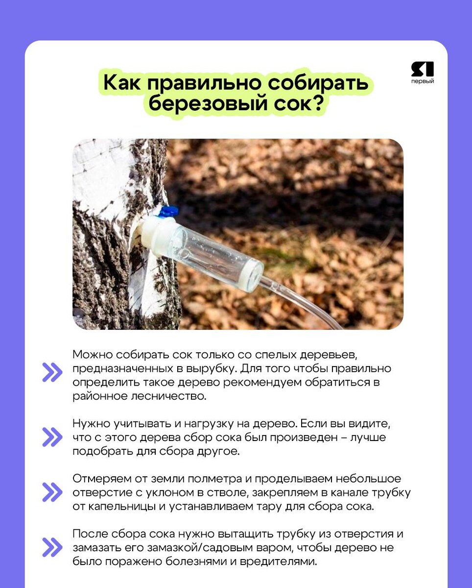 👀 В интернете появились пугающие заявления о том, что любителей берёзового сока будут штрафовать. Но это не так В региональном министерстве природопользования пояснили, что штраф придётся заплатить только тем, кто нарушает правила сбора сока или делает это на особо охраняемых природных территориях. Однако отметим, что относиться к природе нужно аккуратно. Рассказываем в карточке, как правильно без ущерба дереву собрать берёзовый сок⬆️ 🔵 Подписаться | Прислать новость