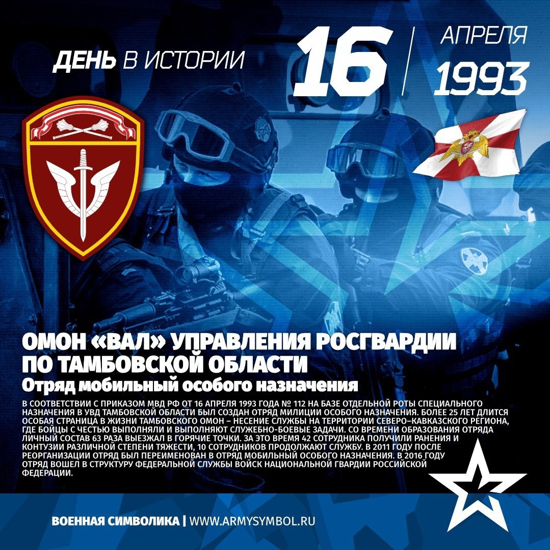 ОМОН "Вал" управления Росгвардии по Тамбовской области с 1993 Отряд мобильный особого назначения В соответствии с приказом МВД РФ от 16 апреля 1993 года № 112 на базе отдельной роты специального назначения в УВД Тамбовской области был создан Отряд Милиции Особого Назначения. Более 25 лет длится особая страница в жизни Тамбовского ОМОН – несение службы на территории Северо–Кавказского региона, где бойцы с честью выполняли и выполняют служебно-боевые задачи. Со времени образования Отряда личный состав 63 раза выезжал в горячие точки. За это время 42 сотрудника получили ранения и контузии различной степени тяжести, 10 сотрудников продолжают службу. В 2011 году после реорганизации отряд был переименован в отряд мобильный особого назначения. В 2016 году Отряд вошел в структуру Федеральной службы войск национальной гвардии Российской Федерации. #ПамятныеДатыВоеннойИсторииОтечества #ДеньВИстории #ГодЗащитникаОт Подпишитесь на наши группы ВКонтакте и в Одноклассниках - читайте, смотрите и к