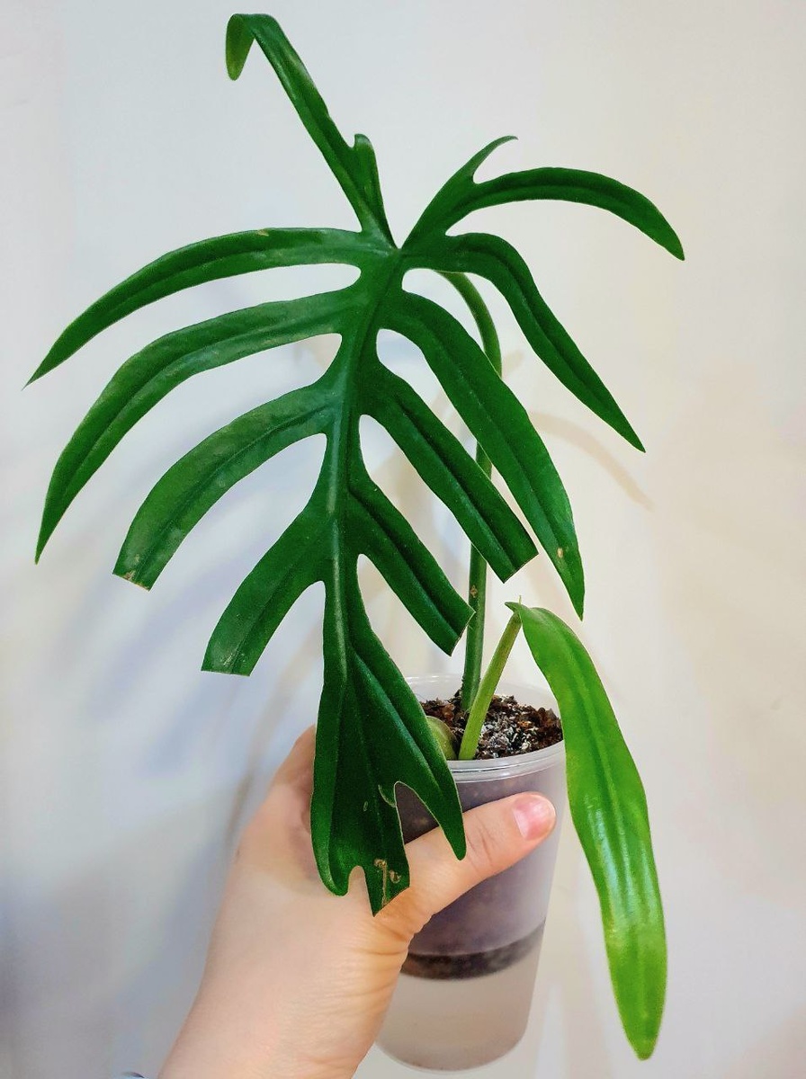 #филодендрон Первый листочек у Филодендрона Элеганс ☘️ Пока что почти прямой, лишь едва видно волнистые края) Дальше с каждым новым листом разрезы будут всё больше 🍃 На родительском листе кончики сострижены, потому что их пожевал Юстас 😬
