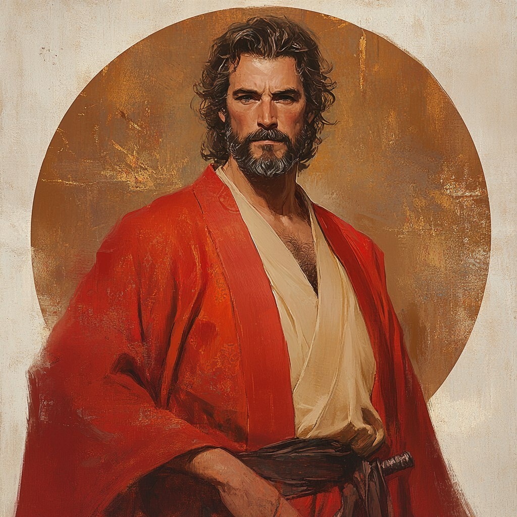 Создано на основе запроса: a portrait, of a king in his mid 30s with a long red robe, almost like a kimono