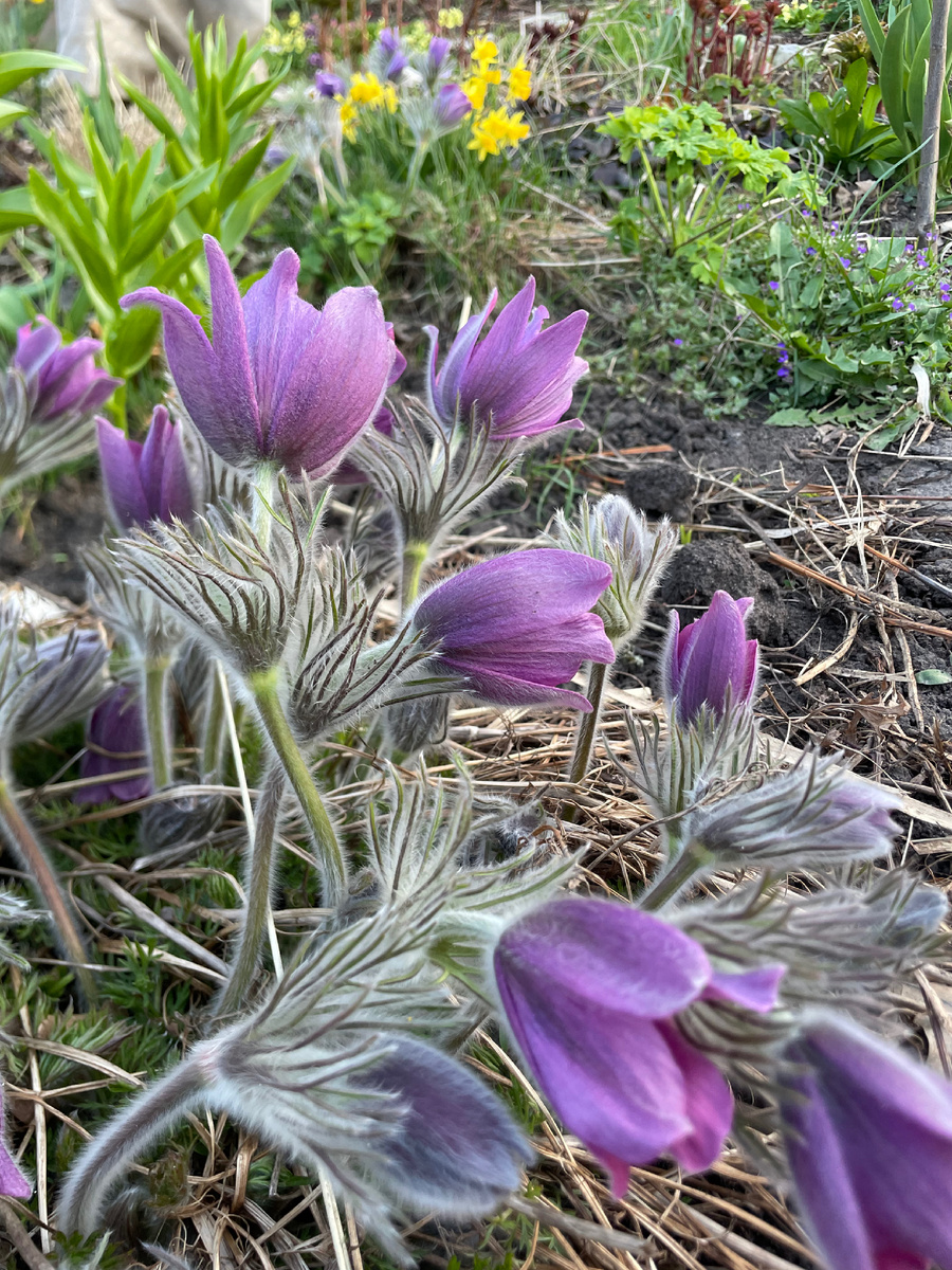 В нашем СНТ новый председатель, который бодро взялся за дело. Создал информационный чат, оповестил о пробном пуске воды. Вода - это золото-брульянты в наших жарких веснах. Поэтому ради возможности собрать немного воды в бак мы снова после работы поехали в сад. Дождь сгладил последствия заморозков, сад цветет, пахнет, жужжит и чирикает. Как раз накануне пасхальных торжеств распустились прострелы. Мне эти растения напоминают одновременно и птенцов, и крашеные яйца, и пушистые почки вербы. Почти все мои прострелы выращены из семян. Да, пару раз покупала рассаду, но к пересадке взрослых прострелов отношусь с большим подозрением. Вроде бы, большинство садовых гибридов прострела обыкновенного можно перенести без деления, но иногда случается фиаско. Вот этот розовый и красный на заднем плане, очень плодовитые товарищи. Дают обильный самосев, который захватывает клубничные посадки. Сбывшаяся мечта - прострел желтеющий. Даже первый единичный цветок - совершенство. И неожиданно сложно мне дос