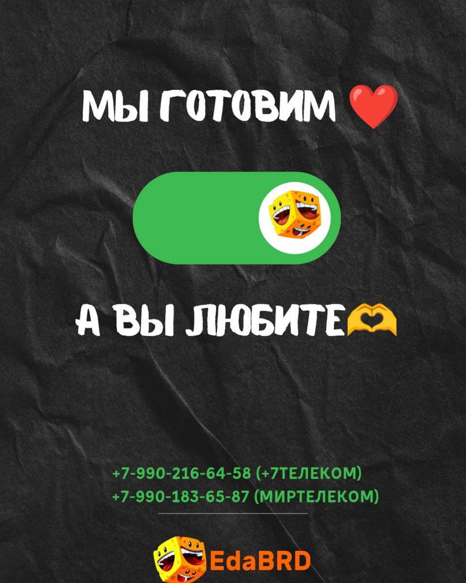 Ваша любимая 🙂 служба доставки уже готова принимать заказы! Выбирайте удобный для вас способ: 📲Звоните нам +7-990-216-64-58 (+7Телеком) +7-990-183-65-87 (Миртелеком) 💬Пишите в мессенджере @edabrd1 🖥Оставляйте заявку на сайте https://edabrd.uds.app Мы всегда на связи и готовы принять ваш заказ!🧡 Также, работает доставка ЗА ГОРОД!🗺 Наши курьеры – это не просто доставщики, это настоящие герои, преодолевающие любые препятствия ради того, чтобы ваш заказ был доставлен вовремя и в целости! Дождь, снег, пробки – ничто не остановит этих отважных ребят! ❤️