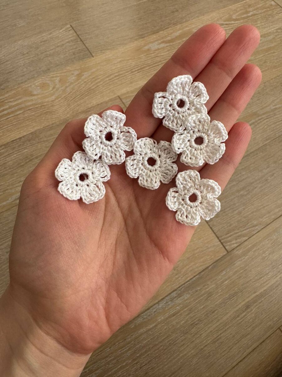 Неделя выдается очень активной и я немного не успеваю по плану 🫣 Но платье «Лилия» стараюсь не забрасывать, и у меня появился первый десяток таких цветочков 🌸 Вяжу по второй схеме(фото 2), но столбиками с 1 накидом, а с третьей фотографии возьму себе идею - пришить в серединку бусину-жемчужину 🤩 Вышивка продвигается за кадром основным процессом 😊