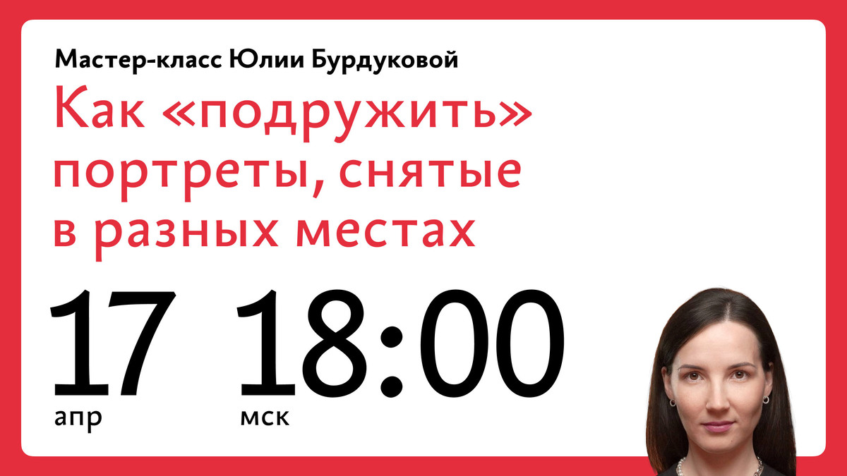 Последний день: не пропустите бесплатный мастер‑класс Юлии Бурдуковой «Как „подружить“ портреты, снятые в разных местах»