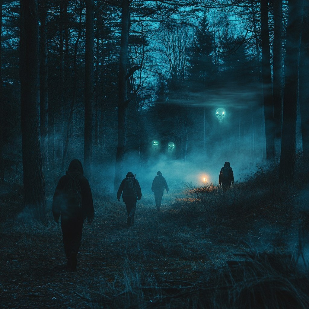 Создано на основе запроса: photography of people walking in the forest at night, spirits at background looking at them, photorealistic