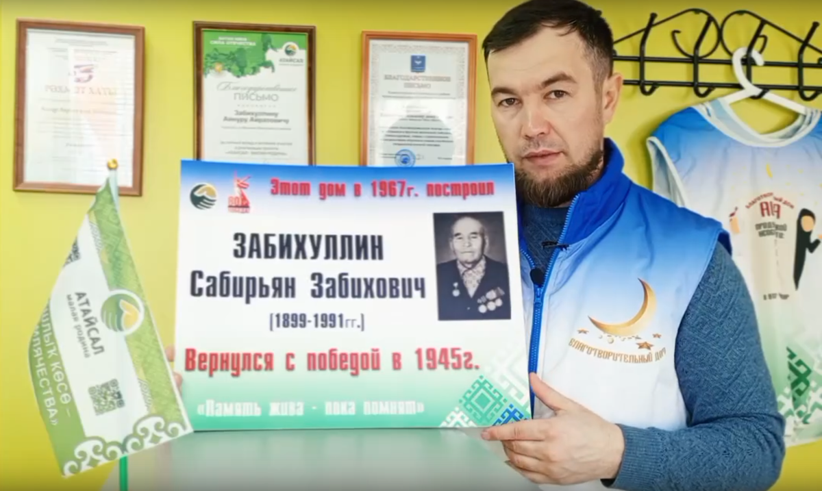 В честь 80-летия Победы руководитель благотворительного дома «Аиша» Айнур Забихуллин из Мечетлинского района организовал акцию «Память жива – пока помнят». Об этом автор инициативы сообщил на своей странице в соцсетях. По словам спикера, суть акции заключается в том, чтобы отметить особым знаком дома, которые построили и где жили или продолжают жить участники Великой Отечественной войны. Это будут таблички с башкирским триколором, информацией о ветеранах и логотипами юбилейной Победы и проекта «Атайсал». Поскольку Айнур Забихуллин давний и активный участник проекта «Малая Родина», именно это обстоятельство и подвигло его организовать акцию. Как рассказал сам автор, башкирское слово «атайсал» в переводе на русский язык означает «отчий дом или дом отца». И он задумался, а кто же возвел дом, в котором он живет? Стал наводить справки и выяснил, что строительство начал его прадед, участник Великой Отечественной войны Сабирьян Забихуллин. Вот тогда и возникла идея с табличками. «Наша семья т
