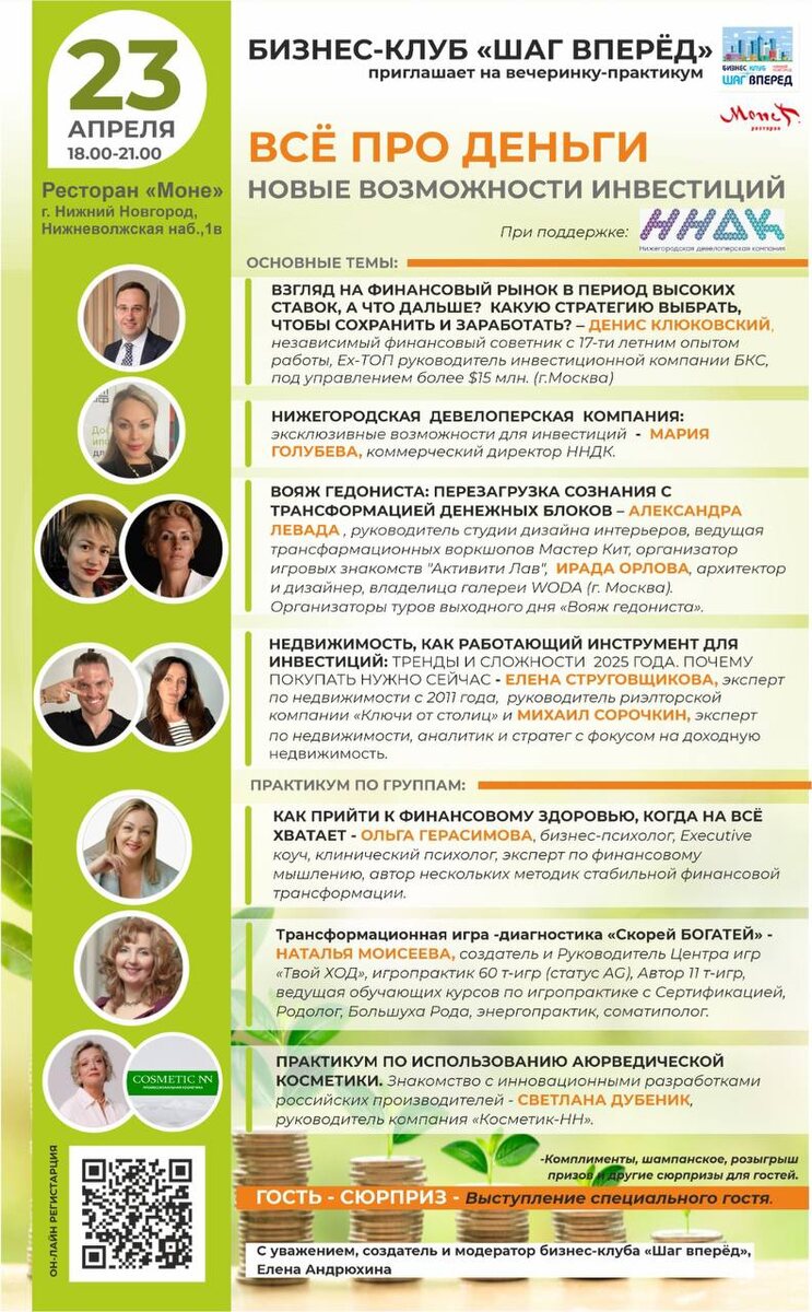 Приглашаю на 👍вечеринку-практикум: «ВСЁ ПРО ДЕНЬГИ. НОВЫЕ ВОЗМОЖНОСТИ ИНВЕСТИЦИЙ». 📌23 апреля, среда, 18.00 - 21.00 📍Ресторан «Моне», г. Нижний Новгород, Нижневолжская наб., 1в ✅Новый подход к деньгам: сначала - теория, потом – практика. ✅Хедлайнер вечера – прогноз от финансового аналитика (г. Москва) ✅Круг единомышленников. Полезные знакомства. Приятная авмосфера. Вся программа и билеты здесь - https://city-klub-shag-vpered.timepad.ru/event/3253766/