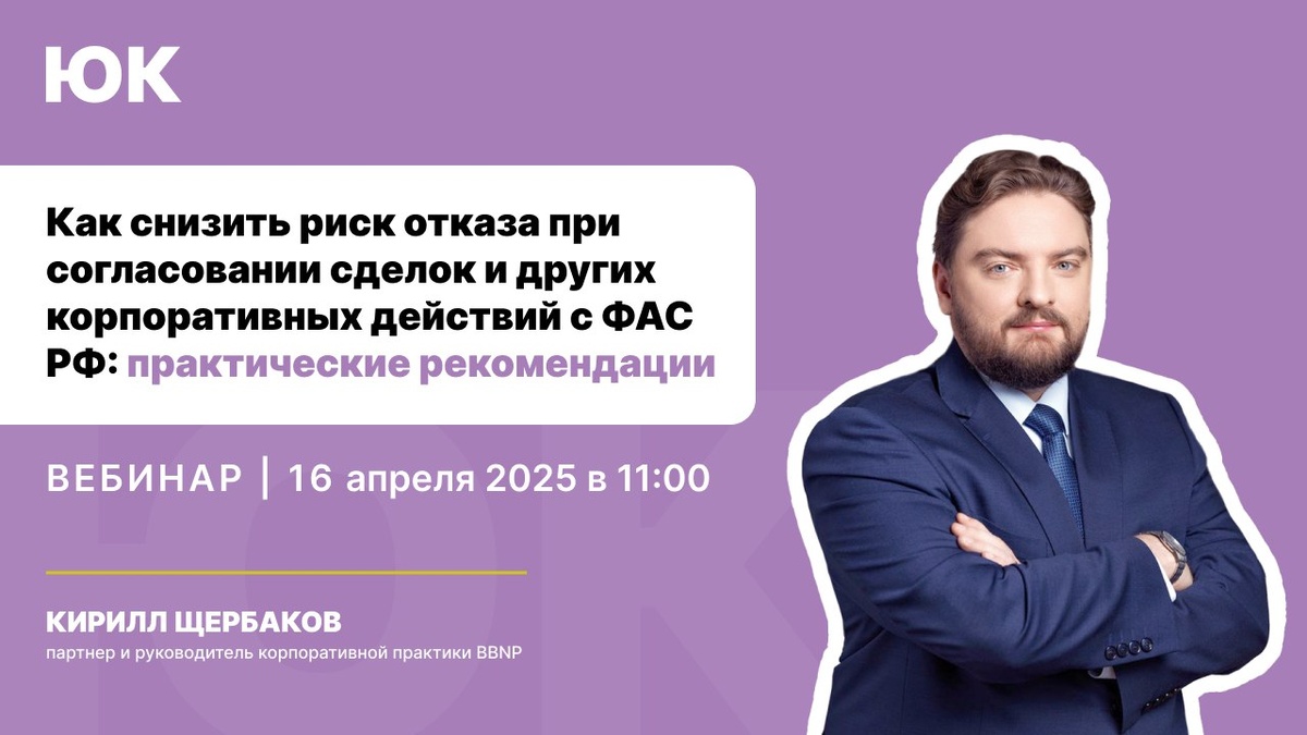 Вебинар на тему: «Как снизить риск отказа при согласовании сделок и других корпоративныx действий с ФАС РФ: практические рекомендации» уже скоро начнётся. ✔️ Кирилл Щербаков , партнер и руководитель корпоративной практики BBNP, на вебинаре поделится опытом и практическими рекомендациями по успешному согласованию сделок и других корпоративных действий с ФАС РФ. Подключайтесь к эфиру сегодня в 11:00. ▶️ Регистрируйтесь по ссылке, чтобы подключиться к прямому эфиру и после вебинара получить запись.