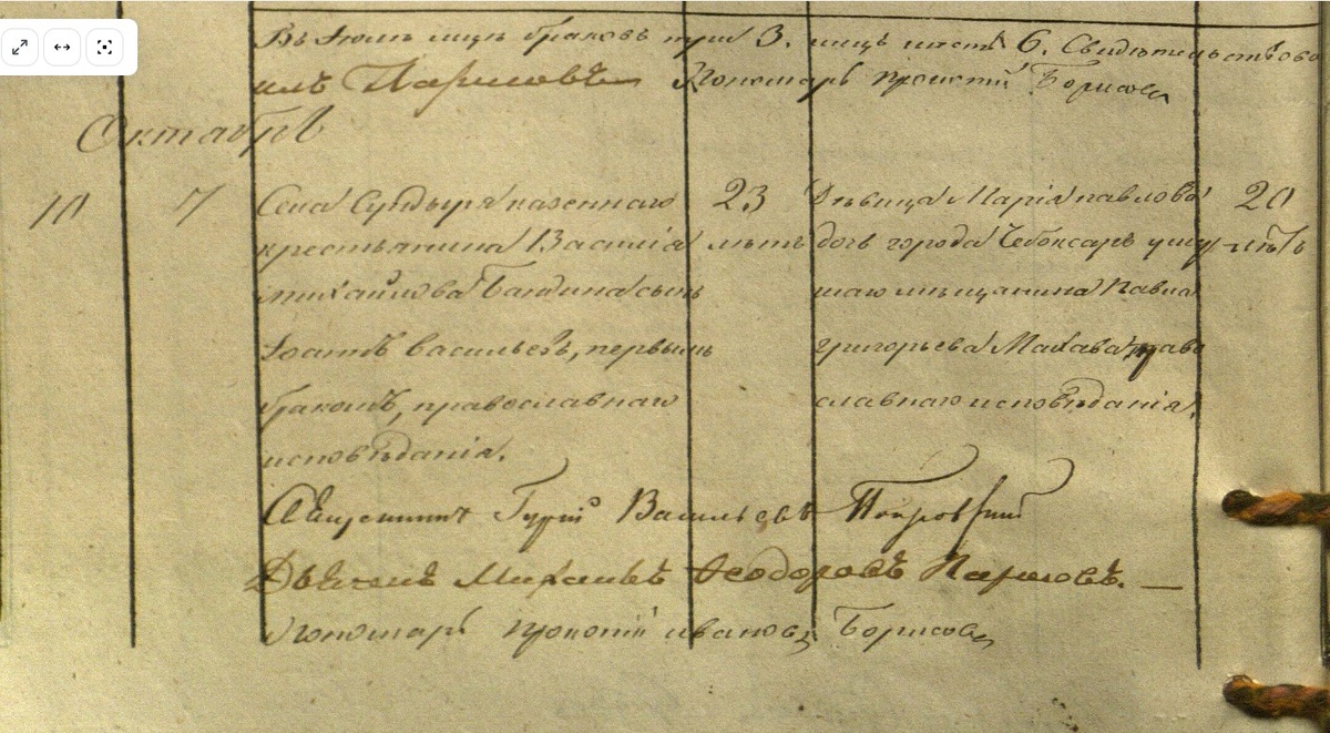 9. 11 числа. Деревни Атыковой околодка Маклашкина умершего из чуваш казённого крестьянина Алексея Егорова сын Иоанн Алексеев, первым браком. 28 лет. Девица Неонила Фаддеева дочь деревни Чодоковой околодка Тоскинеева из чуваш казённого крестьянина Фаддея Прокопиева, 21 года. Поручители по женихе: деревни Атыковой околодка Маклашкина из чуваш казённые крестьяне Василий Иванов, Иона Афанасьев. По невесте: той же деревни и околодка крестьяне Афанасий Николаев и отставной унтер-офицер Андрей Васильев.