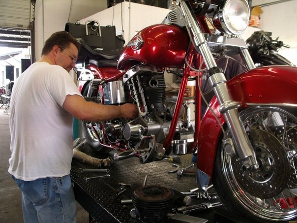 Американская школа исповедует абсолютно другую идеологию. Смысл Эволюшена Харли в том, чтобы ездить, ездить, ездить и снова ездить, а потом завещать свой мотоцикл правнуку-сорвиголове… а ещё лучше — Отправить его куда подальше и отправиться в путь навстречу последнему закату.. Все детали выполнены из металла, по принципу «Надо рассчитать так, чтобы ресурс у этой хреновины был ломовой… а потом добавить сверху ещё процентов 25». Помимо этого компоновка основных узлов такова, что этот двигатель можно полностью перебрать с минимумом инструментов хоть в гараже, хоть на обочине дороги — при том даже не вынимая его из рамы. Вдумайтесь, свечи на Харли можно выкрутить рожковым ключом! Забавно, что мотоцикл, целевая аудитория которого сейчас — не марающие рук офисные управленцы — разработан для удобства копания в нём любому человеку, который знает, с какой стороны держаться за отвёртку.