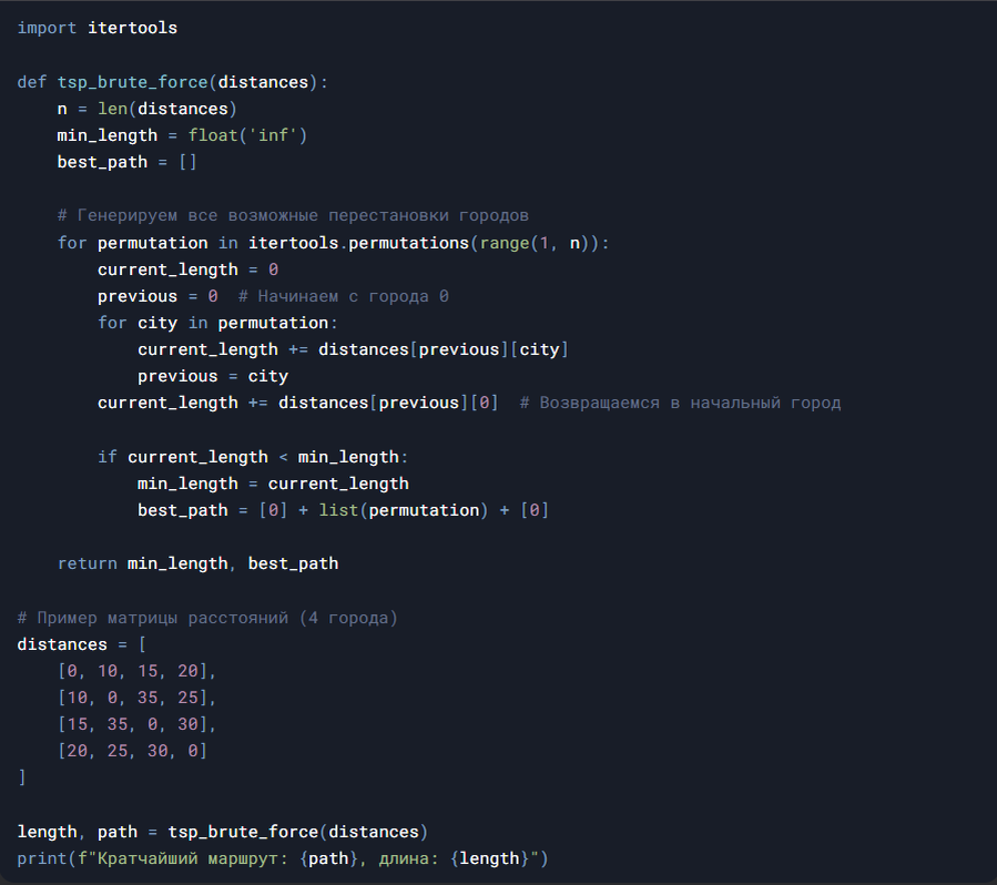Задача коммивояжёра (Traveling Salesman Problem, TSP) — одна из самых известных NP-сложных задач в комбинаторной оптимизации. Её суть заключается в поиске кратчайшего маршрута, проходящего через все заданные города ровно по одному разу с возвратом в исходную точку. В этой статье мы рассмотрим несколько подходов к решению TSP на Python, включая точные и эвристические методы. Для небольшого числа городов (N ≤ 10) можно использовать метод полного перебора всех возможных маршрутов. Хотя алгоритм имеет факториальную сложность O(N!), он гарантирует нахождение оптимального решения. Для больших N применяют эвристики. Один из простейших методов — жадный алгоритм, который на каждом шаге выбирает ближайший непосещённый город. Решение может быть субоптимальным, но работает за O(N²). Для сложных случаев с десятками городов подходят метаэвристики. Установите библиотеку: Используем matplotlib для отображения пути: Метод Точность Скорость Ре