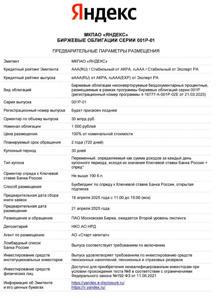 🦹♀️ Здрааавствуйте! Надеюсь, ваше утро ничего себе такое, много думать сегодня не придется :) Ведь в планах лишь два сбора заявок от известных компаний разной степени испорченности. Продлится сие до 14-15 часов по Москве, в зависимости от брокера: 🟢 ЯНДЕКС 001Р-01 📊 🅰️🅰️🅰️ 🔸 Ориентир купона: ΣКС + 1,9% 🔸 PUT/CALL: отсутствуют 🔸 Погашение через 2 года 🔸 Начало торгов - 21 апреля 🙀 МВ.ФИНАНС 001Р-06 📊 🅰️ 🔸 Ориентир купона: не выше 26% 🔸 PUT/CALL: отсутствуют 🔸 Погашение через 2 года 🔸 Начало торгов - 21 апреля 👀 Может и хотел бы про компании что-то сказать, но, пожалуй, оттяну этот стратегический момент до дня начала торгов :) Посмотрим, как закончатся сборы - желаю, чтобы ваши планы они не поломали. Отличного дня :) #облигации #новые_размещения