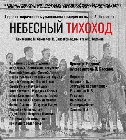Дорогие мои! Ещё один спектакль студентов колледжа искусств 26/04/2025 в 13:00 В концертном зале Ростовского колледжа искусств состоится показ спектакля по пьесе А. Яковлева "Небесный тихоход". Спектакль представляют студенты второго курса отделения "Вокальное искусство", в сопровождении оркестра народных инструментов "Родник", руководитель Зинаида Басенко. Заведующая отделением Романенко Ольга Викторовна, режиссер спектакля - Лысенко Анна Сергеевна. Спектакль раскрывает тему Великой отечественной войны. Это чрезвычайно важные вехи истории нашей страны, которые не должны быть забыты. Ростов-на-Дону, пер. Семашко, 132/141 б Купить билеты #событиягорода #афиша