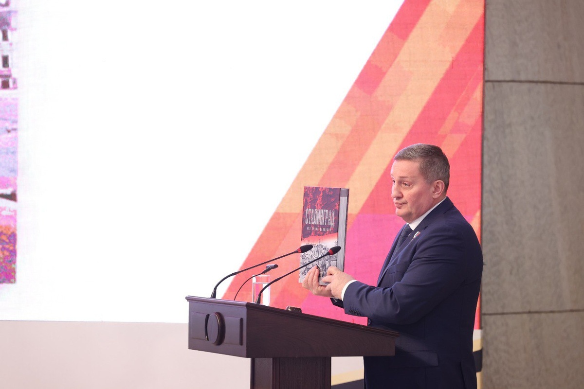 Важное событие организовано в Триумфальном зале музея-панорамы «Сталинградская битва» в годовщину начала победоносной Берлинской наступательной операции Красной Армии. Уникальное издание рассказывает об истории страны и подвиге Сталинграда. Фото: администрация Волгоградской области В Волгограде презентуют историческую книгу «Сталинград. Без срока давности». В значимом мероприятии в год 80-летия Победы принял участие губернатор Волгоградской области. Андрей Бочаров выразил благодарность всем, кто принимал участие в подготовке материалов и издании уникального документа – историков, ветеранов, поисковиков, сотрудников правоохранительных органов и судейского сообщества, а также представителей исполнительной, законодательной власти и журналистов. «Издание исторической книги «Сталинград. Без срока давности» – это еще один важнейший шаг в решении задачи государственной важности по сохранению исторической правды, сбережению исторической памяти и бесценного наследия нашего Великого Отечества»,