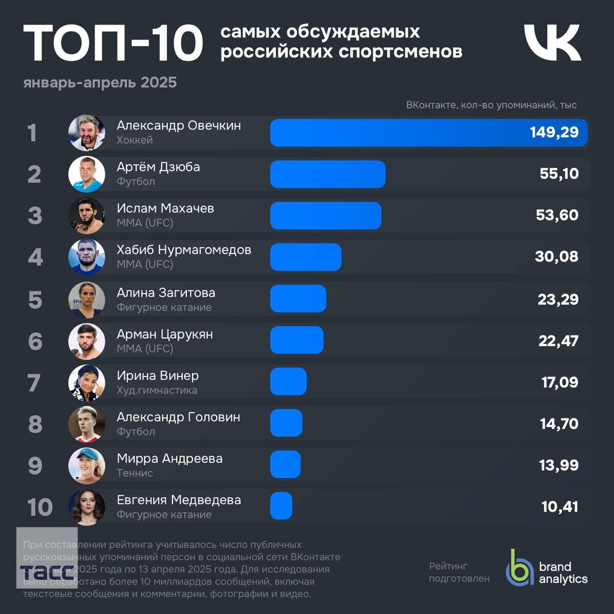 Овечкин — самый обсуждаемый спортсмен во "ВКонтакте" с начала 2025 года, говорится в исследовании Brand Analytics и "ВКонтакте", которое имеется в распоряжении ТАСС. На втором месте Дзюба, а третью строчку занял чемпион UFC в легком весе Махачев. Среди зарубежных спортсменов самым упоминаемым стал Месси. Далее расположились Роналду, Мбаппе и Неймар.