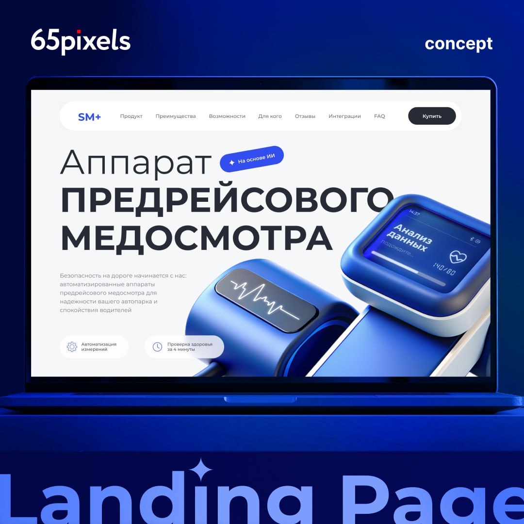 Иногда задача приходит без детальных указаний — только идея ✨ и доверие к нашей экспертизе. Именно так было с этим проектом: в качестве тестового задания для тендера нужно было разработать концепцию лендинга для аппаратов предрейсового медосмотра. В таких кейсах выручает креативность, профессионализм и гибкость. ИИ-инструменты — тоже в помощь! Мы провели анализ и собрали ключевые преимущества продукта. Продумали структуру лендинга: от описания функциональности до FAQ. Использовали нейросети для генерации идей и визуальных решений. Создали адаптивный дизайн с анимациями. И выиграли тендер! 🏆 А кейс на Behance оформили на память 🙂