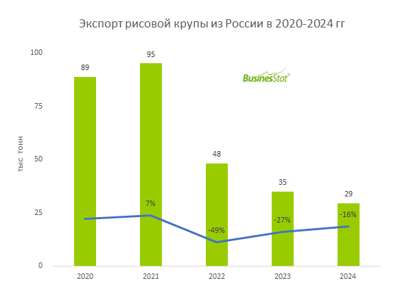 По данным «Анализа рынка рисовой крупы в России», подготовленного BusinesStat в 2025 г, в 2021-2024 гг ее экспорт из страны сократился на 69%: с 95 до 29 тыс т.