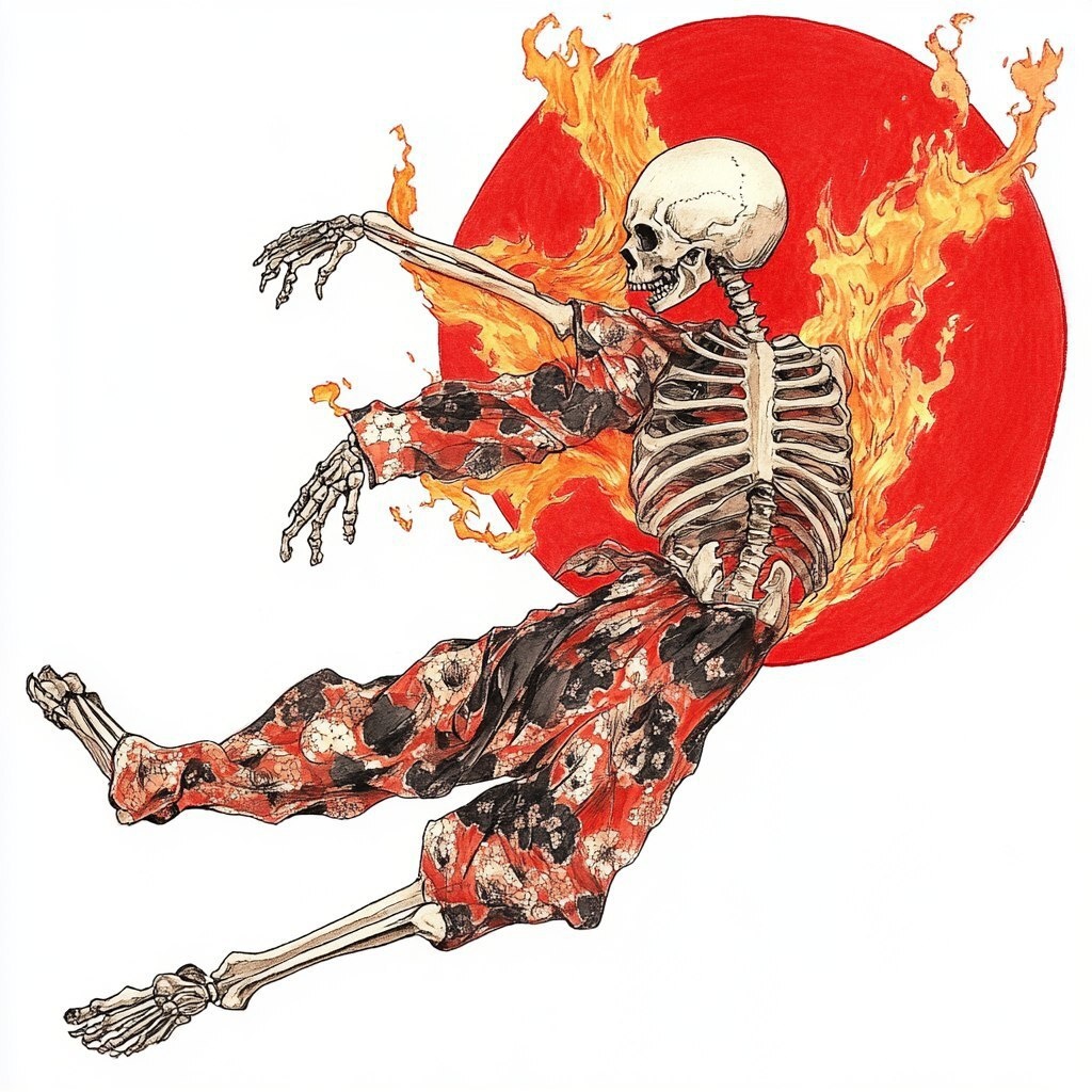 Создано на основе запроса: skeleton falling in the flame, japanese traditional style, white background
