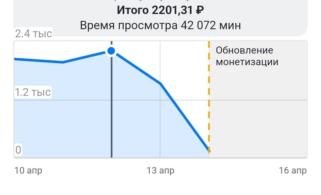 Делюсь наблюдениями за монетизацией по новым правилам Дзена. В общем, она всё. Моя аудитория подписалась, чтобы видео смотреть, а не статьи читать. И монетизация была за время, проведённое при просмотре/чтении. Теперь она только за чтение статей. На прочитывание статьи уходит 1 минута. Посмотреть видео - 8 минут. Ну и на белых скринах видно, как сократилось время, за которое платят. Доход с 2000р в день упал до 136р в день. 🤪 Это просто смех на палке. Но статьи писать надо, потому что там ссылка на бесплатный просмотр видео в Рутубе. Ещё это видео можно посмотреть без рекламы в том же Дзене в Премиуме по подписке 200р в месяц. Смотрит его там, кстати, только треть подписавшихся. Но что же с Рутубом? На нём внезапно стали показывать рекламу, с которой внезапно мне пошёл доход! Посмотрите на чёрные скрины! В апреле я видео загружала вот последние три дня. И за три дня насмотрели почти на условных 3000 рублей (это предварительный расчёт). Возможно, стало иметь смысл развивать Рутуб