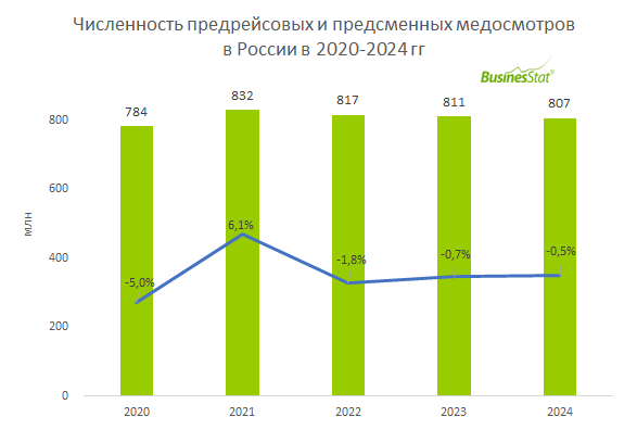 За 2022-2024 гг число предрейсовых и предсменных медосмотров в России сократилось на 3%: с 832 до 807 млн.
