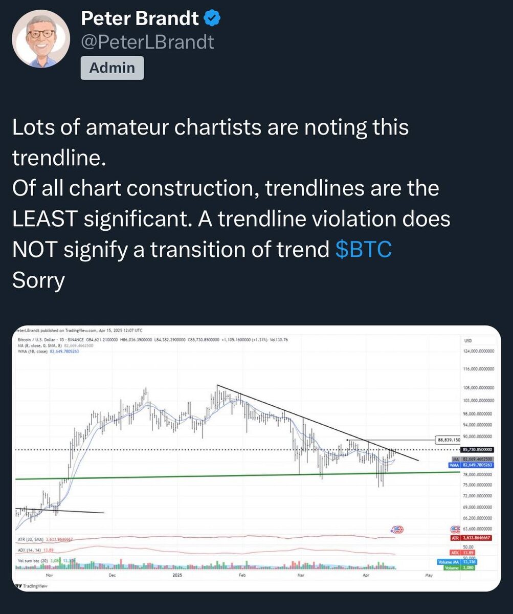 «Линию пробило — значит рост?» Peter Brandt (легендарный трейдер, 60 лет опыта если кто не знает) вчера аккуратно разнёс «любителей трендлайнов» — тех, кто чертит наклонные линии на графике и называет это разворотом. «Из всех элементов теханализа трендовые линии — наименее значимы. Пробой линии не означает смену тренда. Sorry». Что это значит? На графике действительно видно пробой нисходящей трендовой, и часть трейдеров (и я среди них 😅) уже кричат: “всё, полетели”. Но если смотреть глубже — структура рынка пока не подтверждает это: • Нет всплеска объёма • Нет смены поведения покупателей • Нет обновления ключевых экстремумов • ADX и ATR указывают на вялость, а не силу тренда То есть пробили линию — и что? Без контекста это просто пиксели на экране. В чем прикол? На бычьем рынке легко попасть в ловушку: «если свеча закрылась над линией — значит всё, рост». Но рынок устроен сложнее. Поведение капитала, ликвидность, объем, уровни спроса и предложения — вот что действительно ме