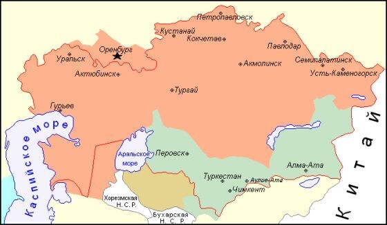 Территория Казахстана (выделена оранжевым цветом) до национально-территориального размежевания