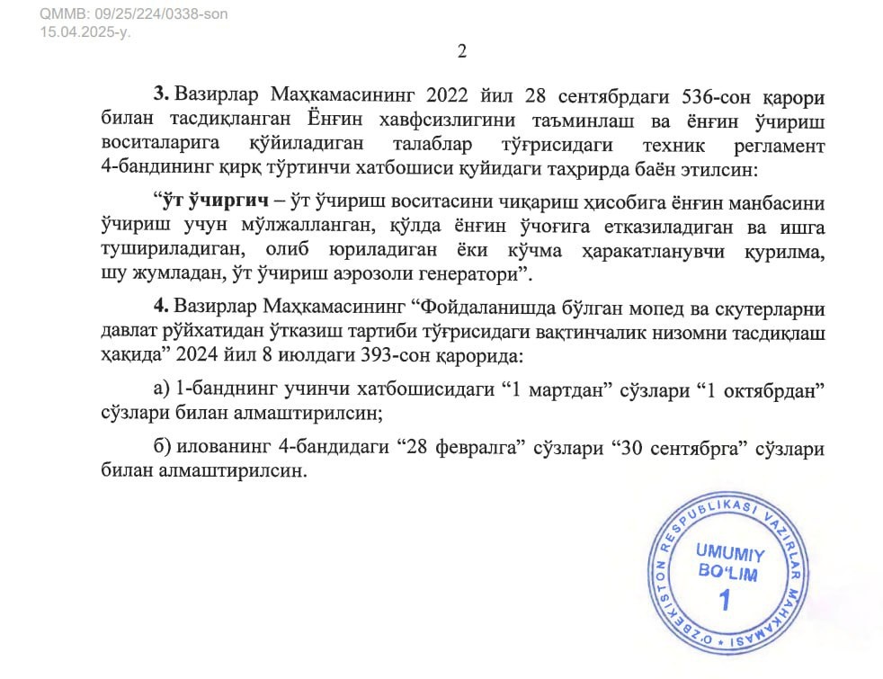 Мопед ва скутер ҳайдовчилари учун ҳайдовчилик гувоҳномаси талаби ортга сурилди Вазирлар Маҳкамасининг янги қарорига кўра, мопед ва скутерни бошқариш учун ҳайдовчилик гувоҳномаси талаб этиладиган сана ўзгартирилди. Aввал 2025 йил 1 март санаси белгиланган бўлса, эндиликда бу талаб 2025 йил 1 октябрдан бошлаб кучга киради. Каналимизга обуна бўлинг ва энг сўнгги янгиликларни кузатиб боринг Jizzaxnews |Тelegram | Facebook | Dzen | YouTubе