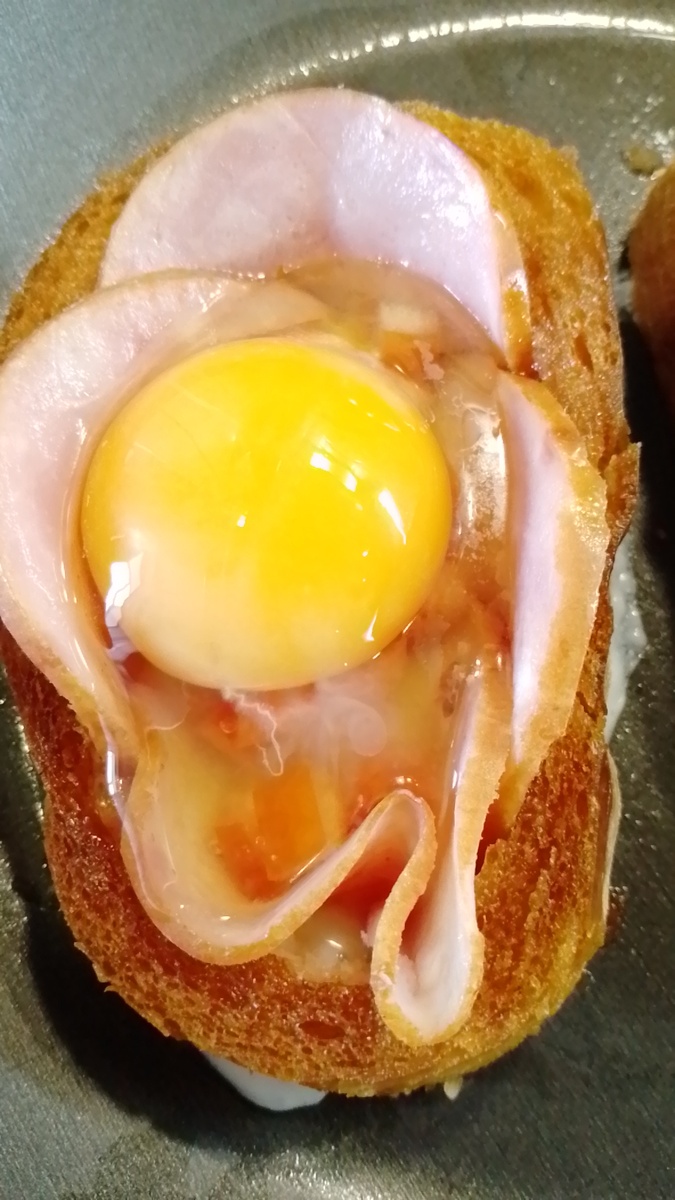 Очень простой, но вместе с тем, красивый вариант яичницы. Белых хлеб режем кусками толщиной примерно 3 см. Вырезаем из середины мякиш. Обжариваем "хлебные колечки"с одной стороны до золотистого цвета. Переворачиваем хлеб и выкладываем внутрь тонко нарезанную ветчину, помидоры и разбиваем сверху куриное яйцо. Закрываем крышкой и готовим на не большом огне до нужной Вам степени готовности желтка. Посыпаем свежей зеленью и подаем у столу. Приятного аппетита!