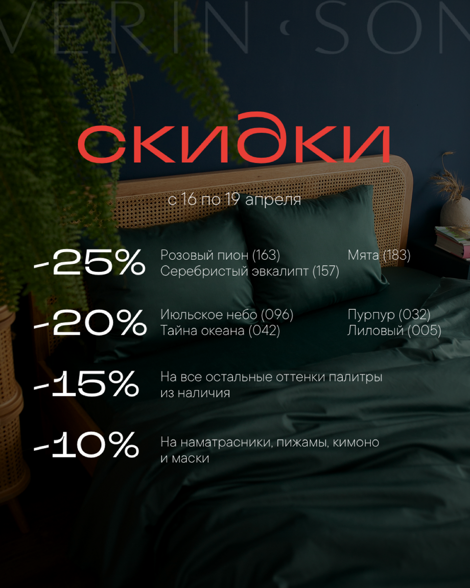 На весь ассортимент скидки от -10% до -25% 🛍️ *размер скидки зависит от выбранного оттенка ✨Успевайте заказать с выгодой, только с 16 по 19 апреля: - комплекты постельного белья; - отдельные элементы (наволочки, простыни, пододеяльники); - халаты, кимоно и пижамы; - маски для сна и бьюти-боксы; - полотенца и наматрасники! ⭐️УСЛОВИЯ: ❗️Сумма скидки на постельное белье и отдельные элементы зависит от оттенка (а не от размеров); ❗️На домашнюю одежду и остальной ассортимент действует скидка 10% вне зависимости от цвета.