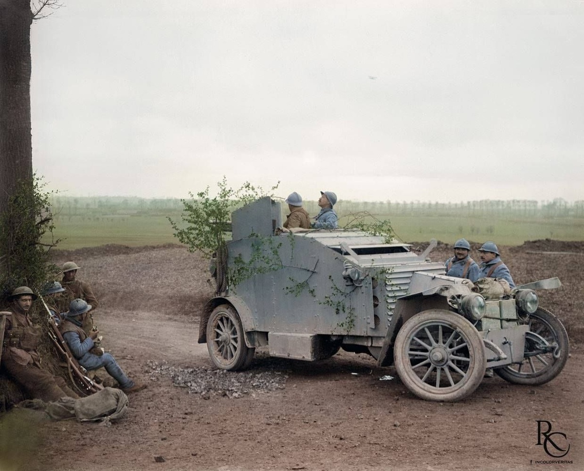Британские и французские солдаты отдыхают у броневика Renault M1915, 16 апреля 1918 года. Колоризация от "In Colore Veritas". Эта фотография была сделана фотографом лейтенантом Джоном Уорвиком Бруком недалеко от французской деревни Метерен во время наступление на Лисе.