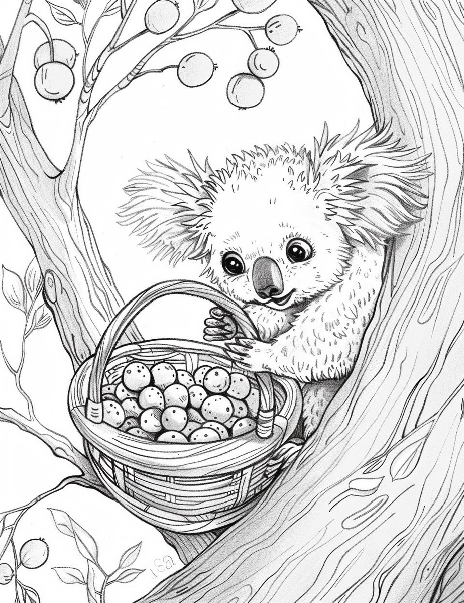 Создано на основе запроса: A simple black-and-white coloring page for toddlers (3 years old) showing a cute cartoon koala waking up in a tree. A koala placing big berries into a round basket. Three or four berries only, no background. --- Автоперевод: Простая черно-белая раскраска для малышей (3 года), показывающая милую мультипликационную коалу, просыпалась на дереве. Как тебе такая генерация? 🤔 https://dzen.ru/id/65c0c65c86e4f837c27b24d7 #ИИ #AI #нейросеть #midjourney #art