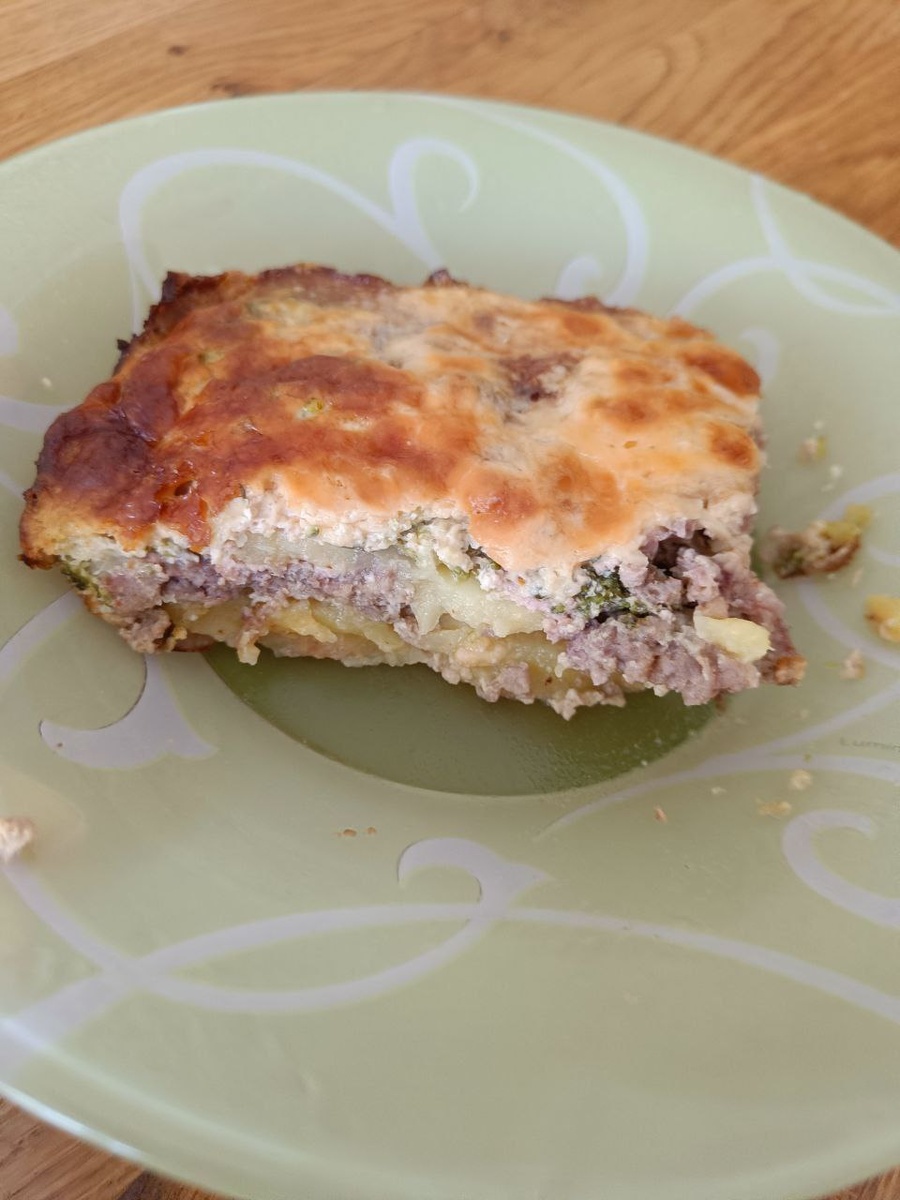 Ужин сегодня - фирменная запеканка! Делюсь рецептом: стеклянную форму смазать топленым маслом, послойно выкладываем картофель, фарш мясной (у меня говяжий), лук, специи, брокколи замороженные прорезанные, сыр тертый смешанный с яйцом. Выпекать, закрыв фольгой, при 200* 40-50 мин, в конце снять для румяной корочки.