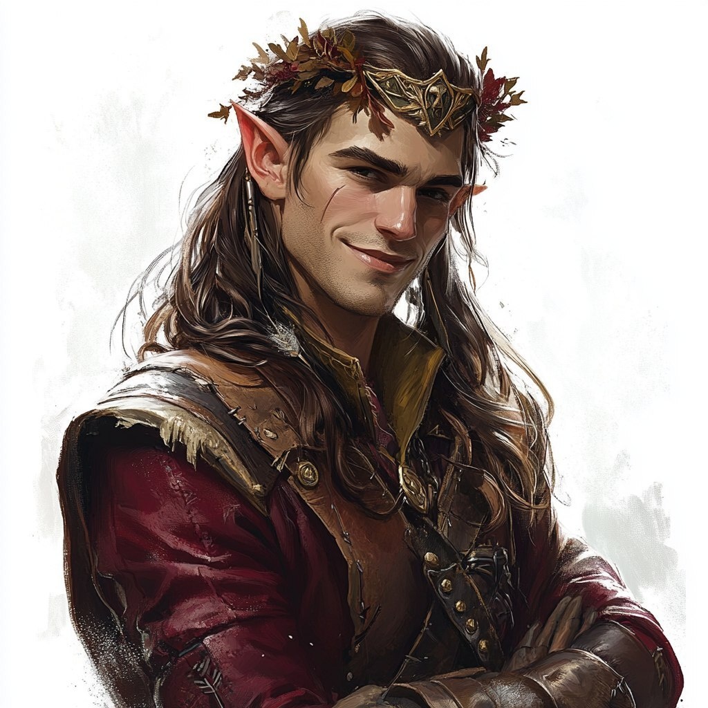 Создано на основе запроса: D&D character male adult elf, brunette long hair, rouge, bandit, wearing the magic item crown of lies, leather