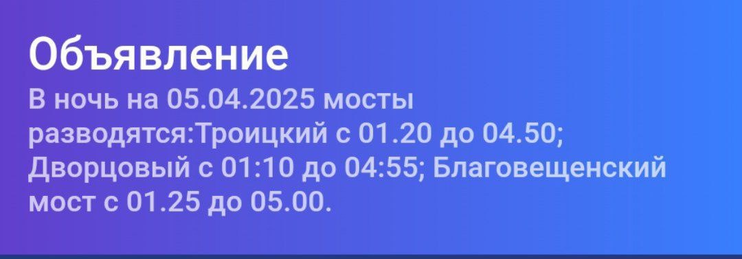 ❗️Этой ночью на 05 апреля разводят несколько мостов: ❌ Дворцовый 1:10 - 4:55 ❌ Троицкий 1:20 - 4:50 ❌ Благовещенский 1:25 - 5:00 👉 Высокий Спрос. Подписаться Ваш таксопарк: «Высокий спрос» 🚕 89697774262 📲 Комиссия от 1% 💰 (Подключаем ко всем фирмам такси и доставки) 🚗📦 #такси #водитель #курьер
