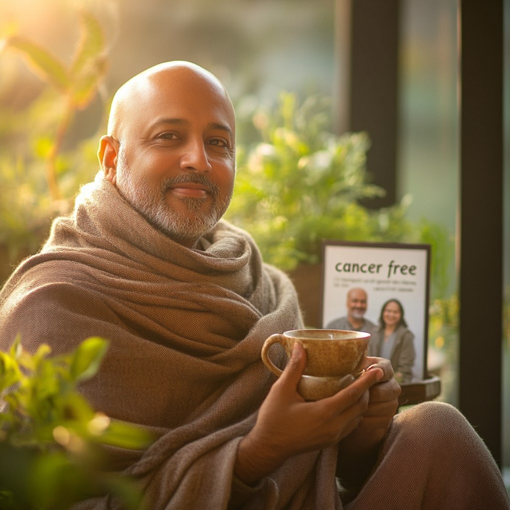 Создано на основе запроса: Bald Indian man, late 40s, sitting on a sunlit balcony, peaceful and joyful expression, wrapped in a soft shawl