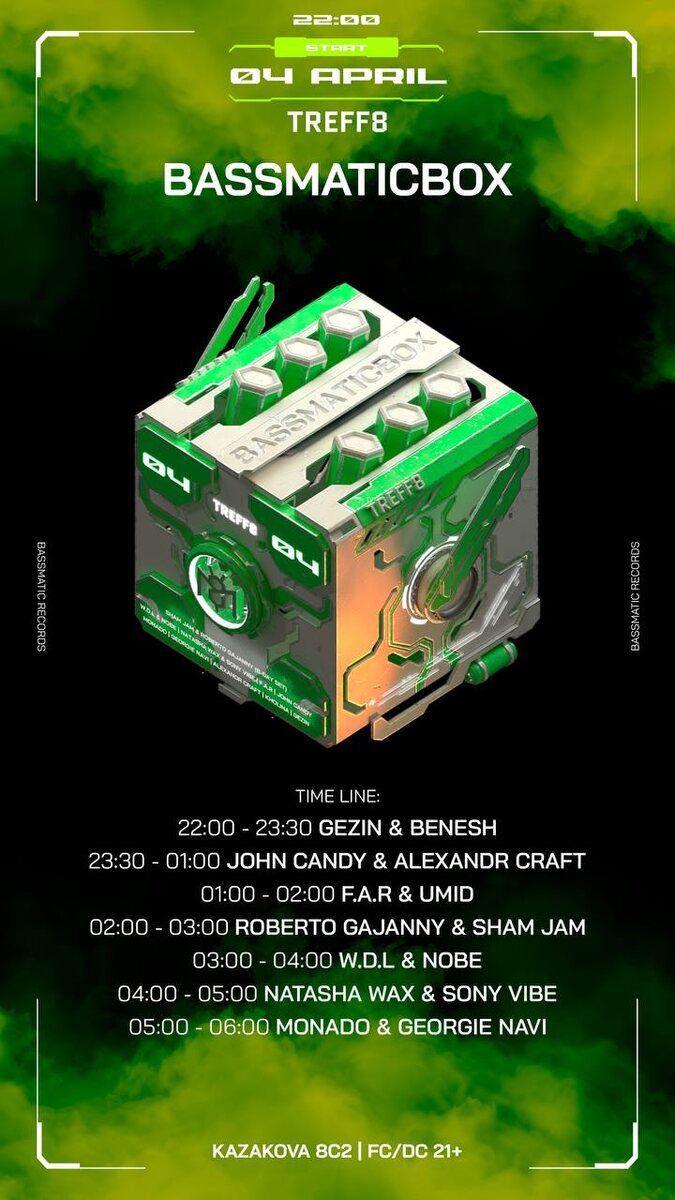 BassmaticBOX @ Treff8 4 апреля Приглашаем вас в эту пятницу в нашумевший клуб с уникальным звуком от Danley Sound Labs - TREFF8, где пройдет ивент BassmaticBOX. Сохраняйте расписание выступлений! 🎫 Инфо/ билеты bassmaticbox.com FC / DC 21+ 📆 4 апреля, 22:00 — 07.00 📍 Treff8 Club, Москва, ул. Казакова, 8, стр. 2