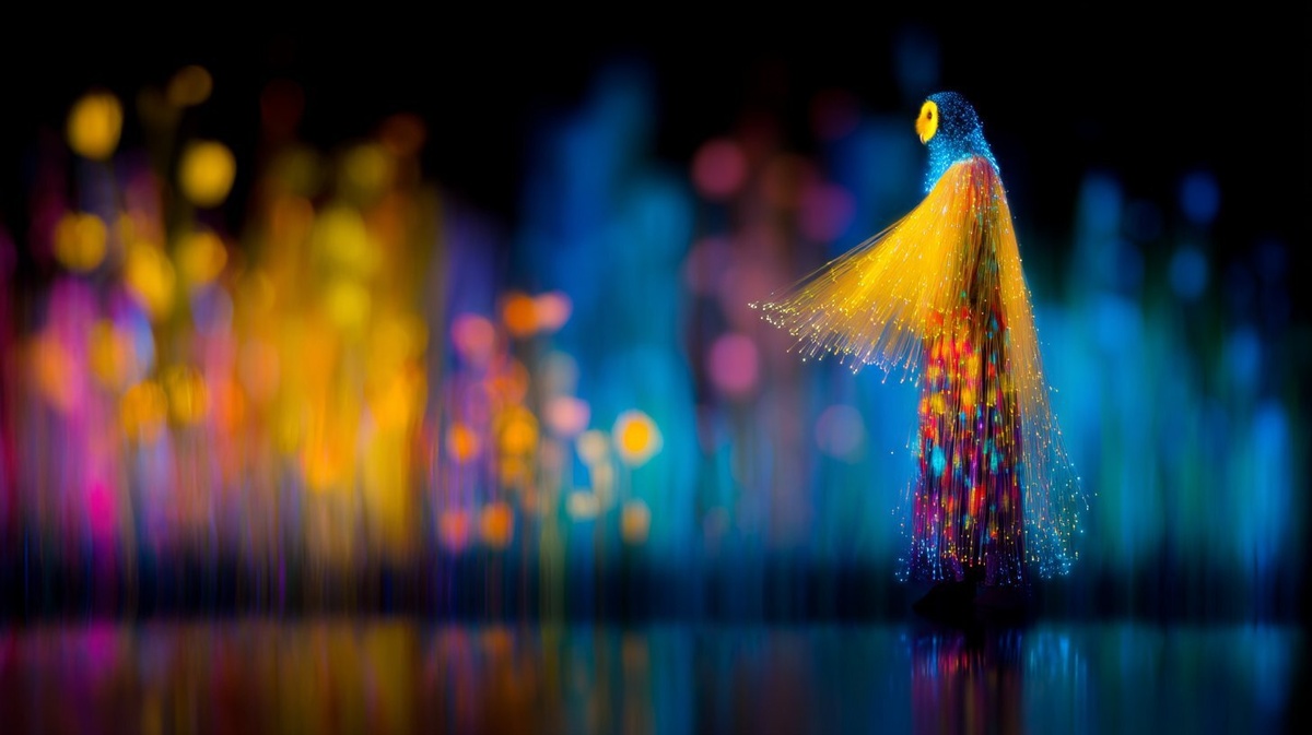 Создано на основе запроса: The Nightkeeper’s Robes A conceptual portrait of a model wrapped in translucent organza robes embedded with fiber optic filaments that extend into a wide collar mimicking a blooming owl’s wingspan. Several fiber optic floral owls fly above, mirrored in a reflective surface below. Shot at night with long exposure streaks, layered LEDs, and soft atmospheric haze. Regal, ritualistic, and haunting. --- Автоперевод: Ночной одежды одеждает концептуальный портрет модели, завернутой в полупрозрачные маври органзы, встроенные в волоконно -оптические нити, которые распространяются в широкий воротник, имитирующий крыло цветущей совы. Классно выглядит? 🤔 https://dzen.ru/id/65c0c65c86e4f837c27b24d7 #ИИ #AI #нейросеть #midjourney #art